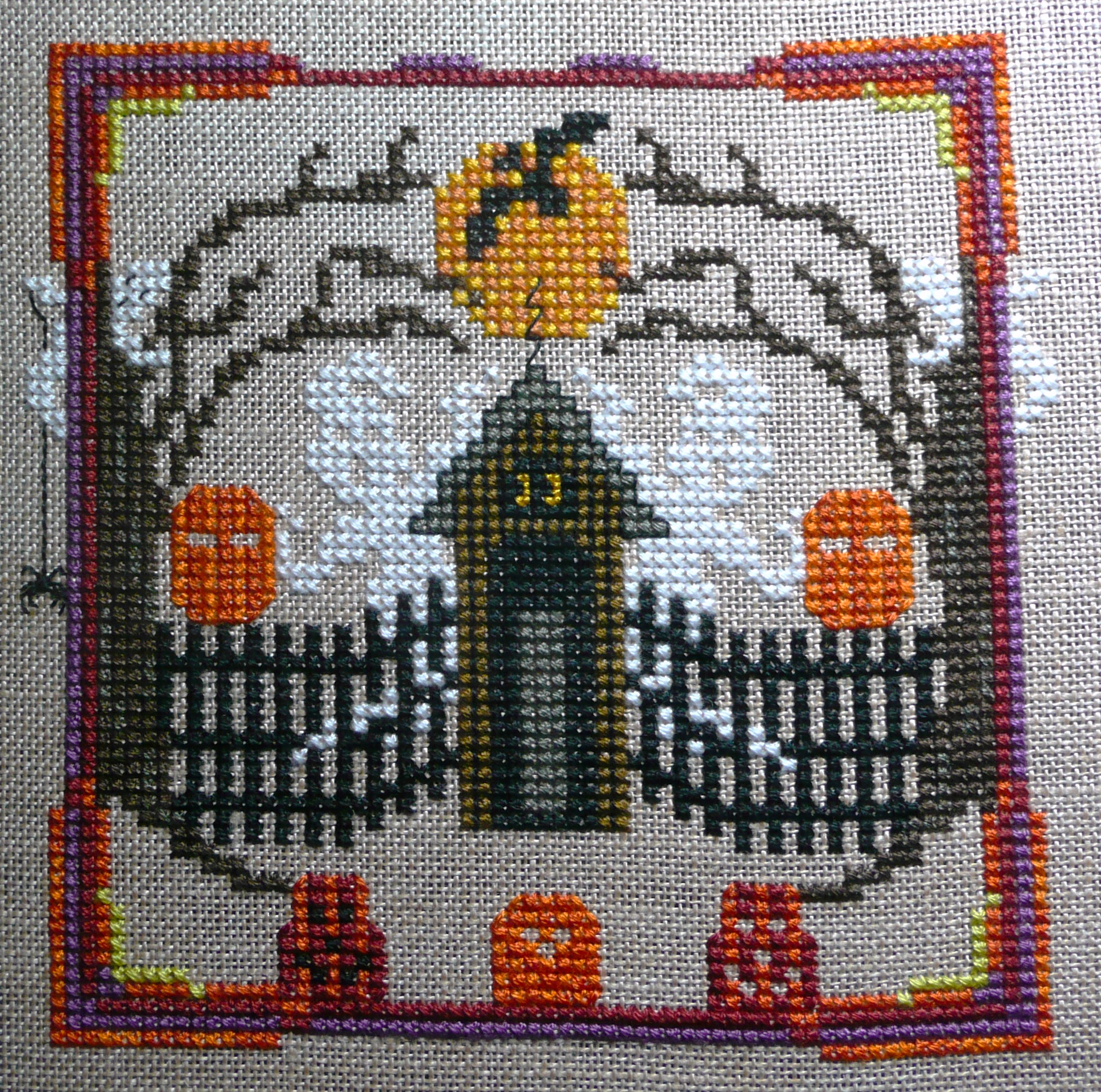 Without further ado, here’s the latest WIP photo of Ghastly Ghostly Ghouls – it’s also likely to be the final work in progress photo, as the next time you see it it will hopefully be an actual finished project – I reckon just one more night, maximum two nights, in front of the gogglebox will see this finished off – there are just 3 froggies, a bunch of eyes and pumpkin backstitching, and 2 teeny ghost heads at the bottom plus 2 over-one kitty cats, and 4 yucky spiders in the corners … yeah, 2 nights should do it, easy!