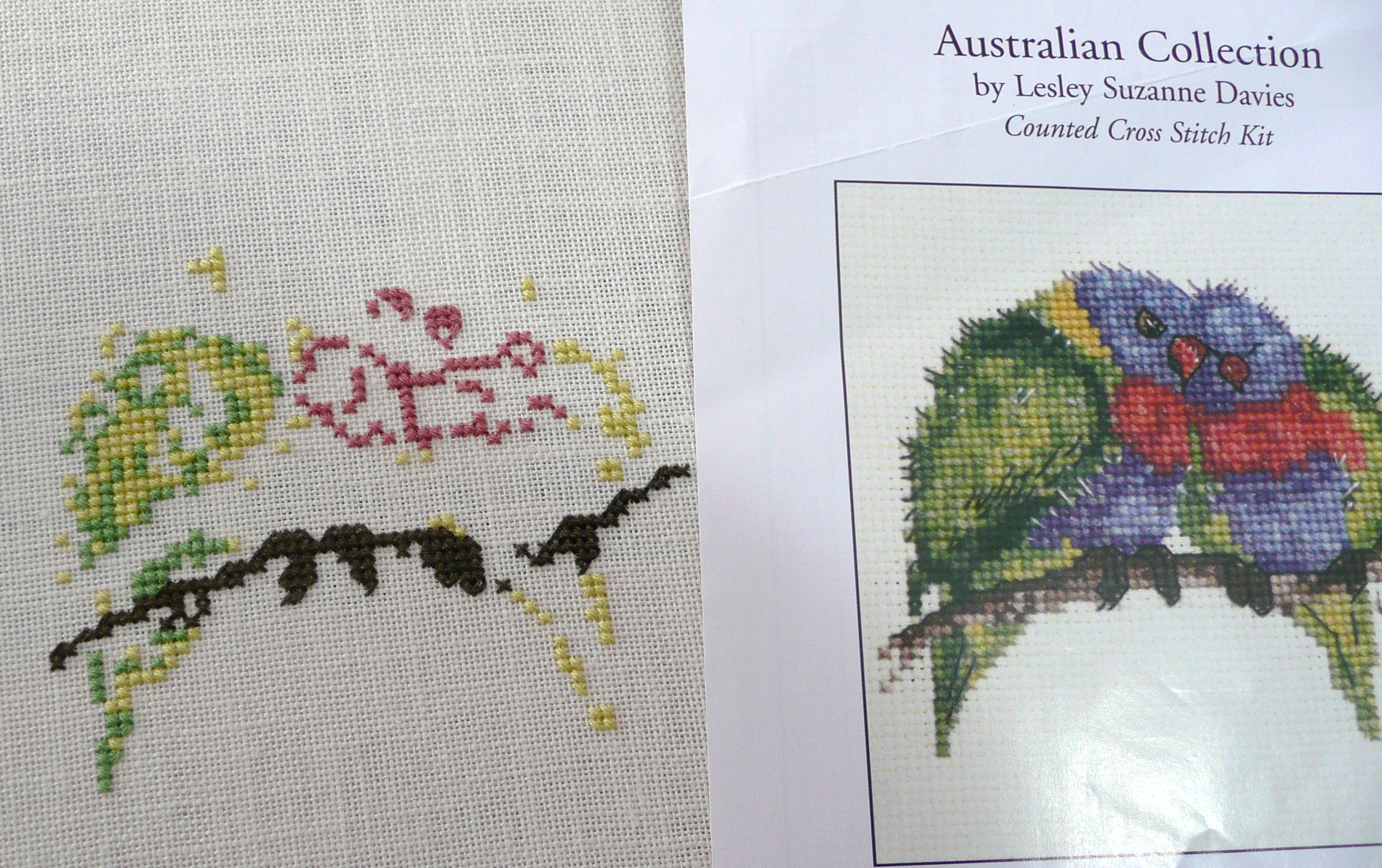 Anyway, back to my 2011 challenge … I eventually picked up my first project for the challenge, DMC’s Rainbow Lorikeets. I decided that I refused to do housework all day, and intended staying in my jim-jams all day watching TV and stitching … which I did {{insert happy sigh here}}. Alas, I was so engrossed in watching TV it took me a while to realise that I had made a big blue with the kit threads – what I thought was Yellow Green Lt thread was in fact the Moss Green (although why the hell you would call something moss green that actually IS yellow-green is beyond me) … I didn’t realise until I had stitched a huge amount of the adjoining green, and then looked and thought “what the…?” – sure enough, a quick review of the chart piccie confirmed my worst suspicions …
