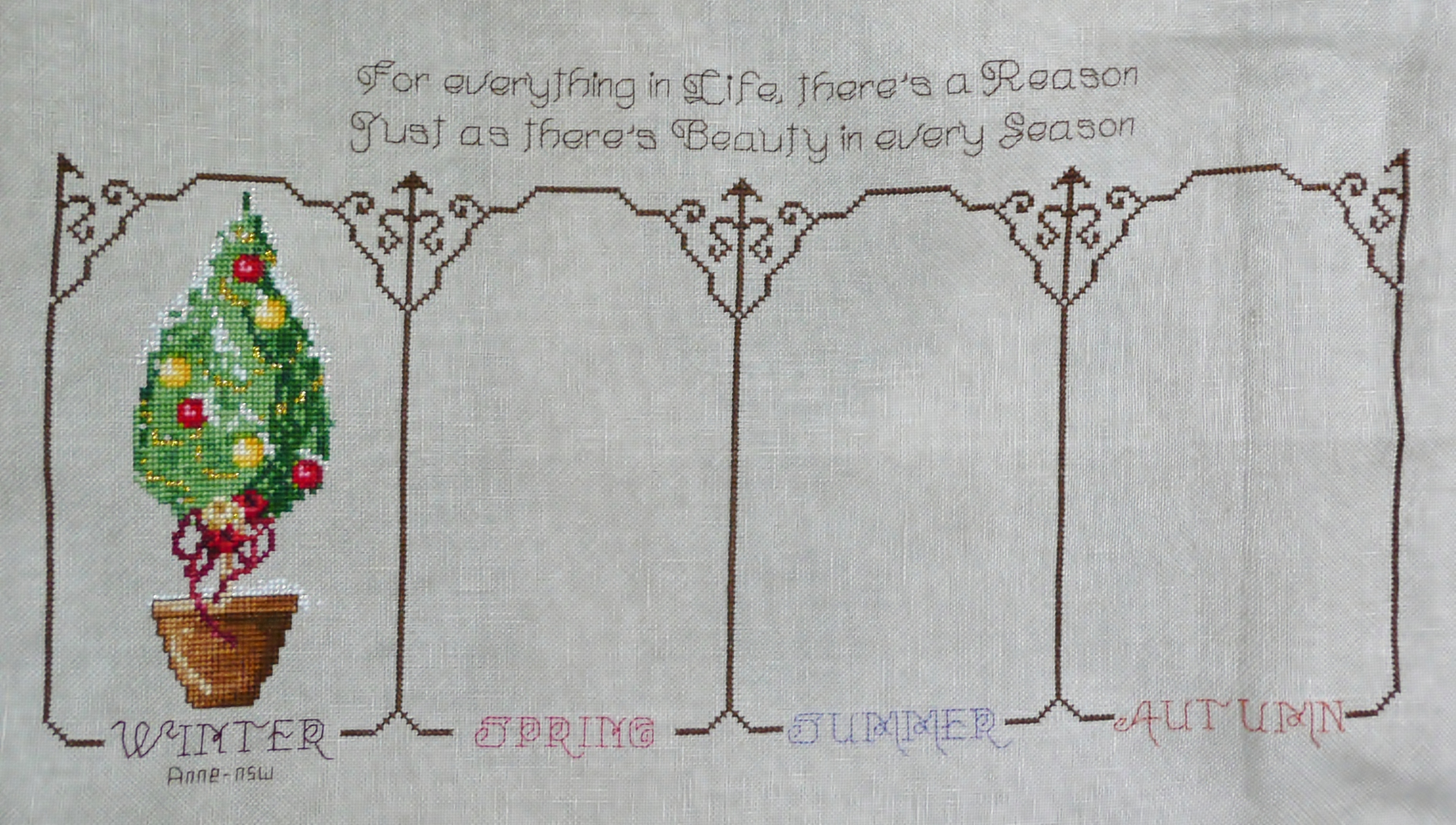 Work is mental busy, so I haven’t had much stitching energy this month – although last weekend I had a stitching marathon for 2 solid days, when I managed to stitch my RR piece. Next week I’ll be flying home to be support for Mum and Dad after Dad has surgery – I’ll be working over there, so probably won’t have much down time either, and not much time for stitching … I’ll still be packing a few projects, though, just in case … I fully intend heading home with a much better prepared suitcase than I did last time! And on that note I’d better hit the hay for the night, as I need to spend the day in the office tomorrow catching up on work before I fly out …