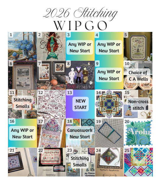 Here’s my stitching WIPGO board for the year – I also have another board for sewing projects, cardmaking products, and reading books (it lists all the authors I own the most books from, and I choose a book by that author each month).