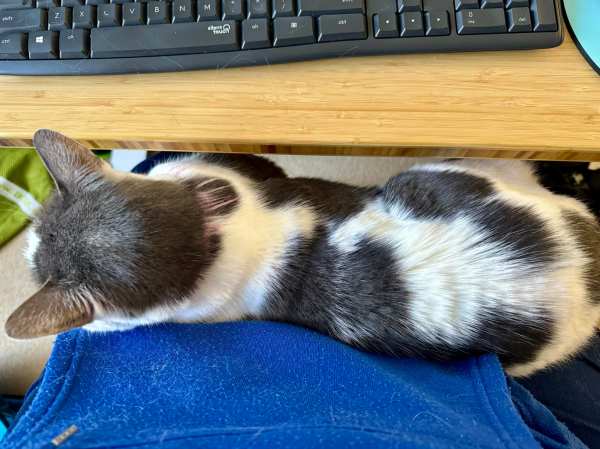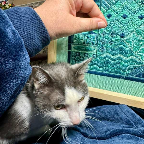 My stitching mojo wasn’t helped by the fact I adopted a beautiful wee kitty who, after settling in, decided that she likes to sprawl all over my lap making stitching more challenging … something I need to work on improving in the new year. Smudge was the old family pet of a dear stitching friend that had to be rehomed due to no fault of her own, and she was 11 years old when I took her in – we bonded really quickly and she’s been an amazing companion that likes to follow me around and sleeps where she can see/hear me and is almost always found on my desk or on the floor by me when I’m working etc. She’s a total sweetheart that has captured my heart 100% since the minute she arrived on my doorstep ❤ I’ll add more favourite photos at the end of the post 🙂