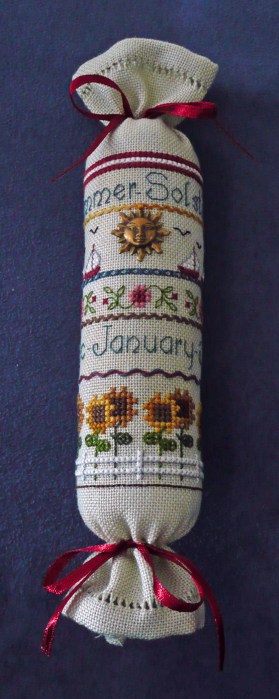 “Summer Solstice Needleroll” by Eventide Designs Stitched on 28ct hand-dyed Dried Thyme Jobelan with recommended threads but changed the months to be Dec-Jan-Feb to be in line with the southern hemisphere seasons