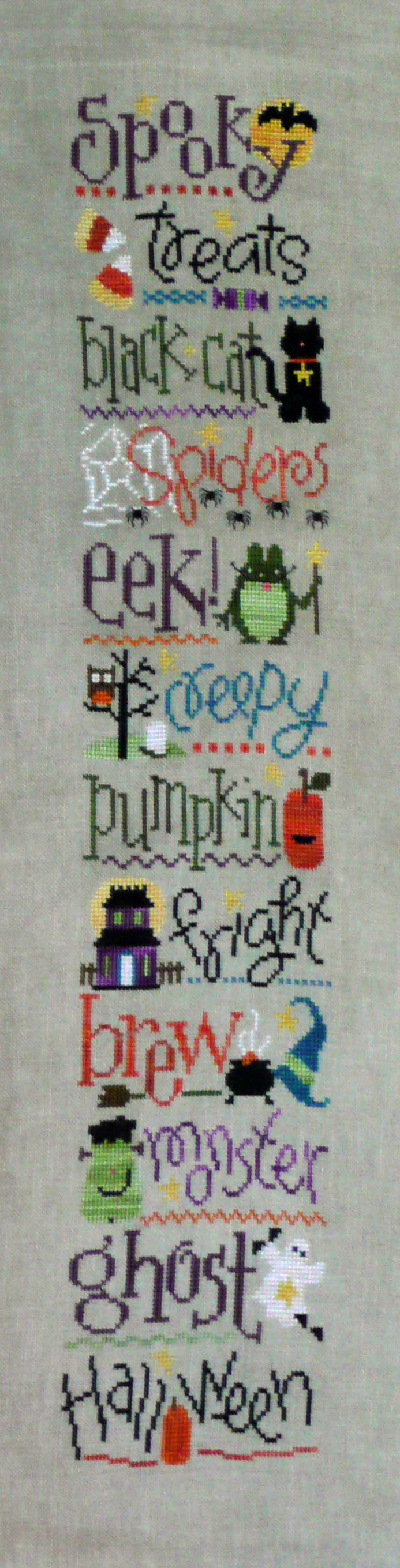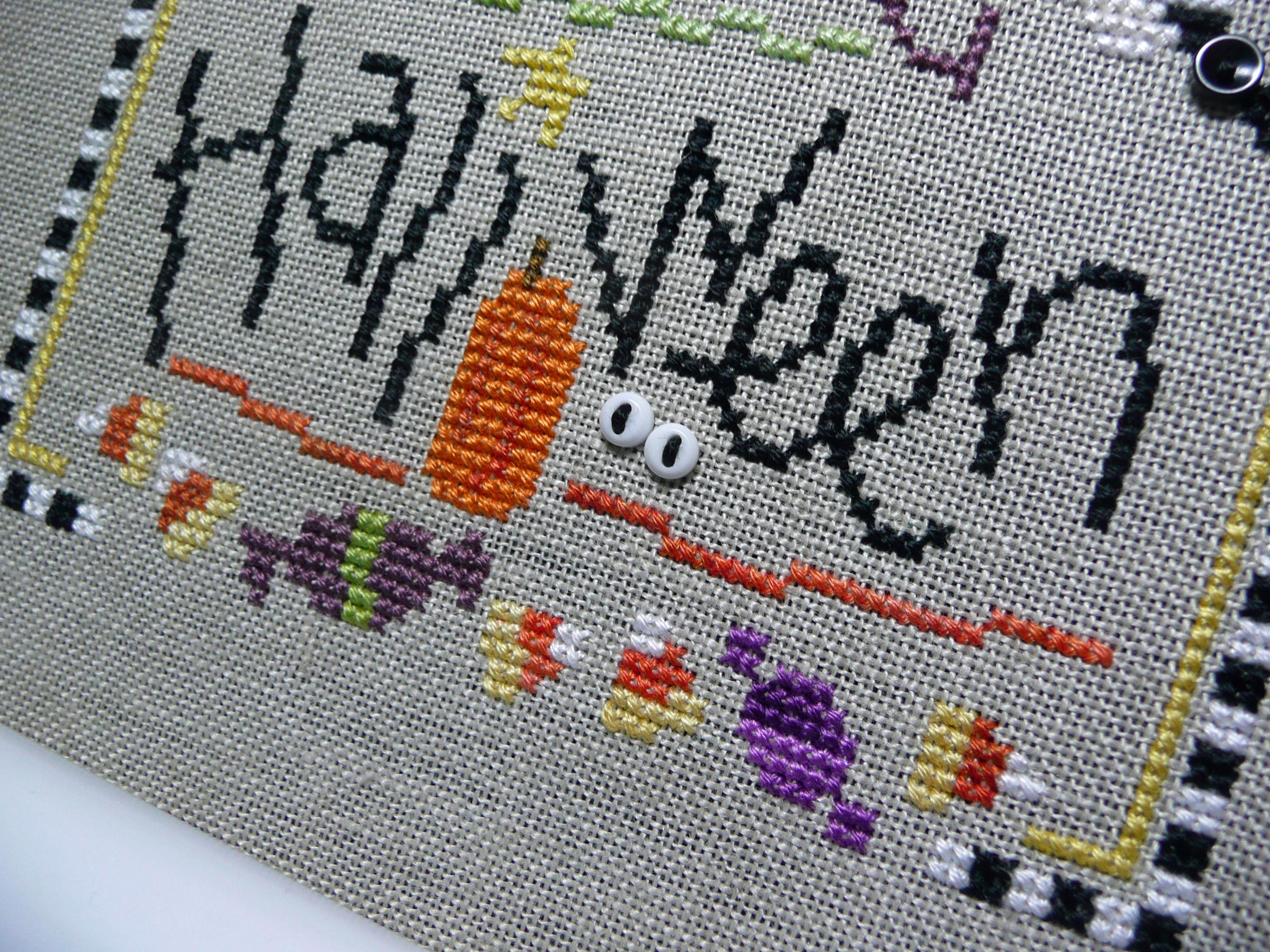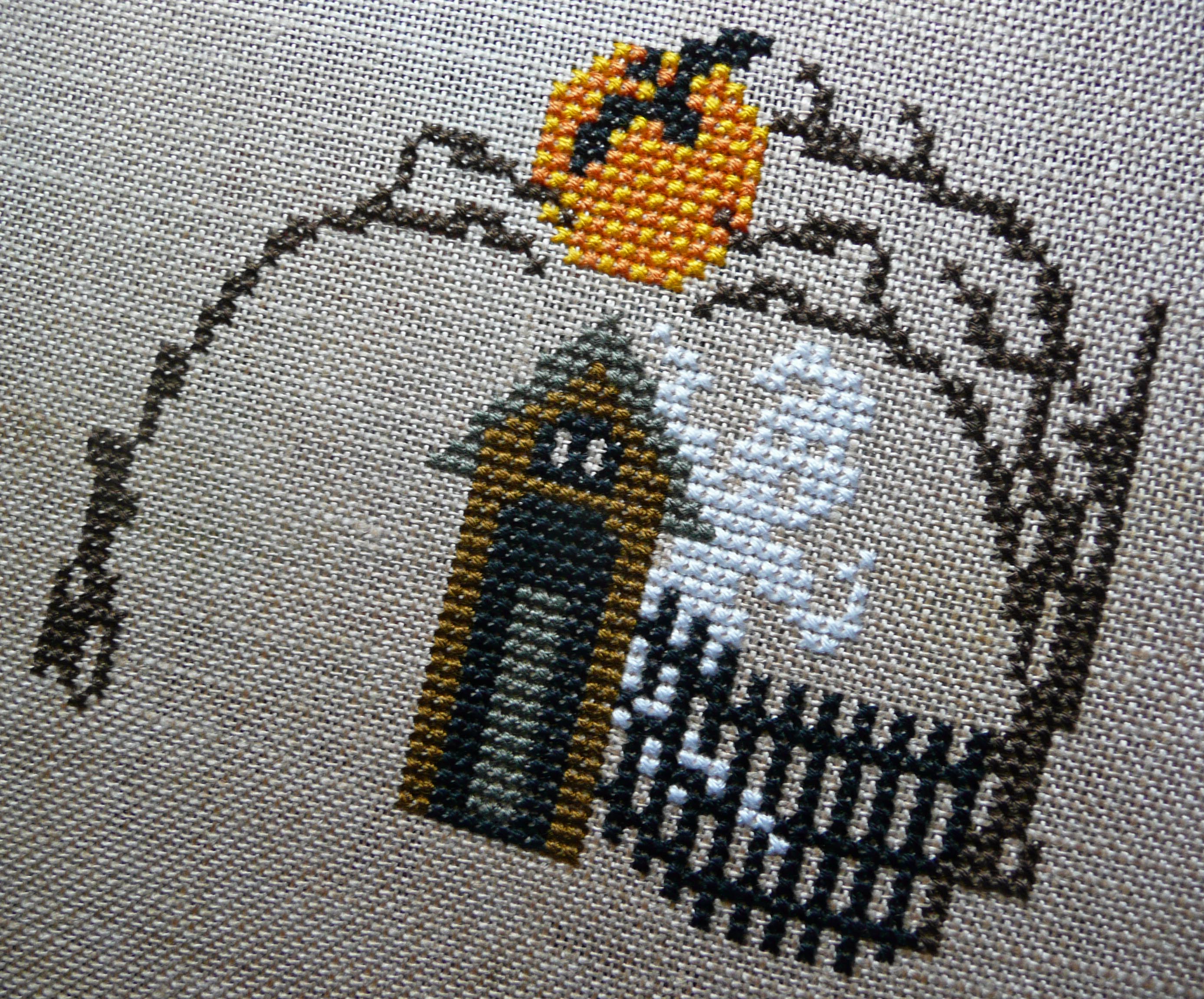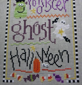 Anyway, while I was housesitting I sat in front of the huge TV and stitched away while working my way through B&N’s DVD’s and episodes of The Mentalist and ER that I’d missed. The main result of that was that I completed all of the stitching of Lizzie*Kate’s Boo Club – now all I need to do is attach some buttons, but that won’t be happening any time soon. I changed loads of threads in this piece, substituting for those I didn’t have in my stash … when I publish the final finished piccie with the buttons, I’ll add all the substitution details, along with the fabric etc 🙂