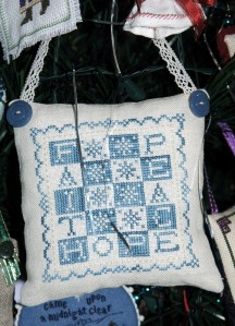 Before I show piccies of the decorations, I want to say a heartfelt “thanks” to one of my closest stitching pals Katrina who has been spoiling me for a number of years now with a handmade ornie – each one I treasure dearly, and this latest one is absolutely no exception! (Excuse the silver lametta sitting on the top!)