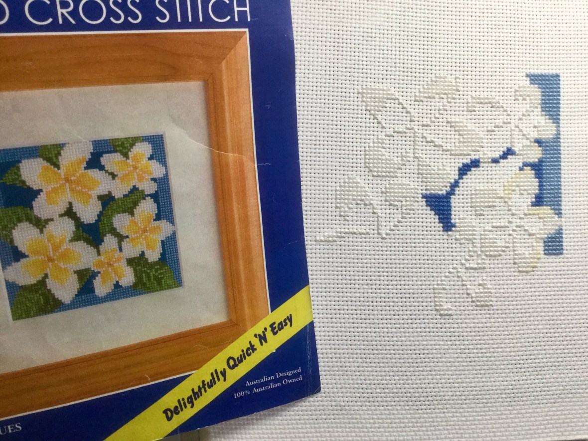 Then while I was waiting for midnight to arrive on New Year’s Eve, I sat and unpicked a very old UFO that Mum had started for me not long after she started stitching. Unfortunately our stitching tensions are so vastly different that it would have looked terrible to combine both sets of stitching, so I’m starting it again from scratch myself. Mum has agreed she won’t stitch it, and her eyesight isn’t good enough to stitch anyway at the moment, but I’ll still think of it as ‘Mum’s stitching for me’, as she chose the kit knowing I love frangipanis.  She gave it a good attempt, but it’s time to get it out of the UFO pile and into the finishing pile 🙂  Unfortunately, though, I think some of the threads have been mixed up, so I’ll need to find somewhere that stocks Anchor threads to make sure I’ve got all the right threads (there are 4 greens in the WIP envelope, but only 3 greens in the design for example, plus there are a red and a brown thread in the WIP envelope and these aren’t used at all – Mum must’ve had a senior moment I think).