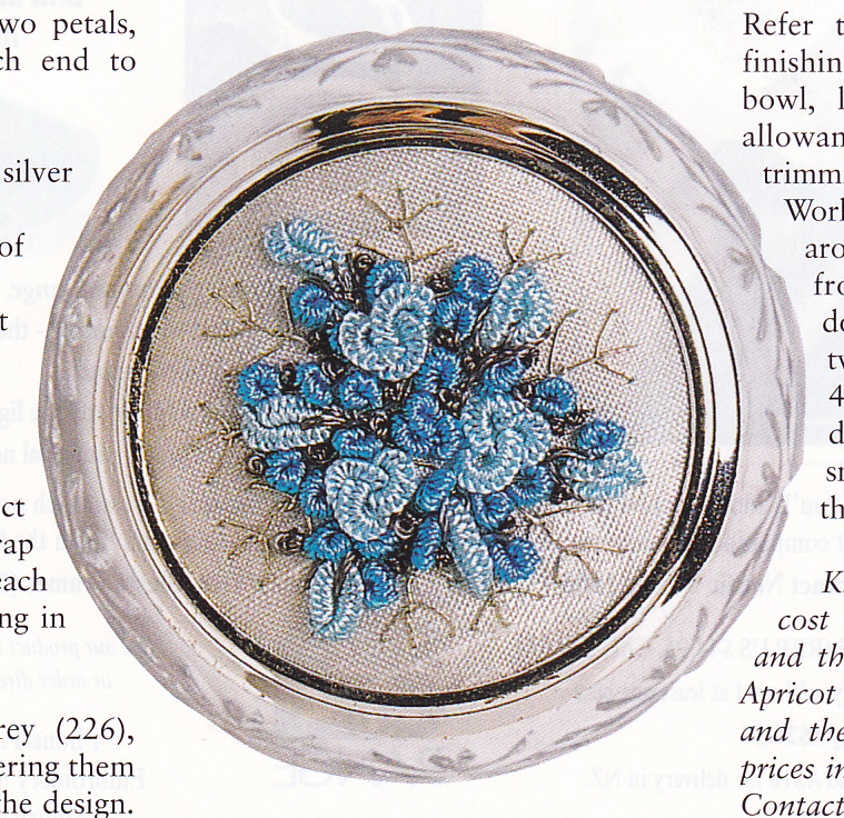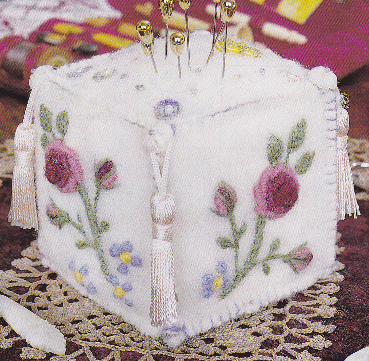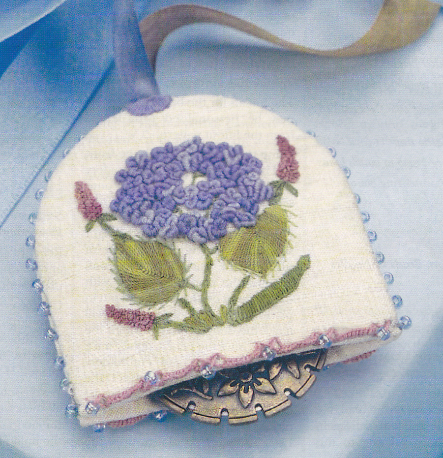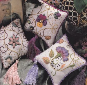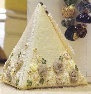 Since I’ve been getting all enthused about different stitching techniques, I’ve been thinking that many of the new techniques that I want to try are very do-able as pincushions, and I’ve found many projects within the Embroidery & Cross Stitch and Inspirations magazines that will fulfil that urge nicely. I thought I’d share some of the little projects that made me smile and that I’d love to attempt … and believe me, this is just teensy weensy sampling – there are many, many, many more … these are predominantly from Embroidery & XS and Inspirations magazines in my stash.