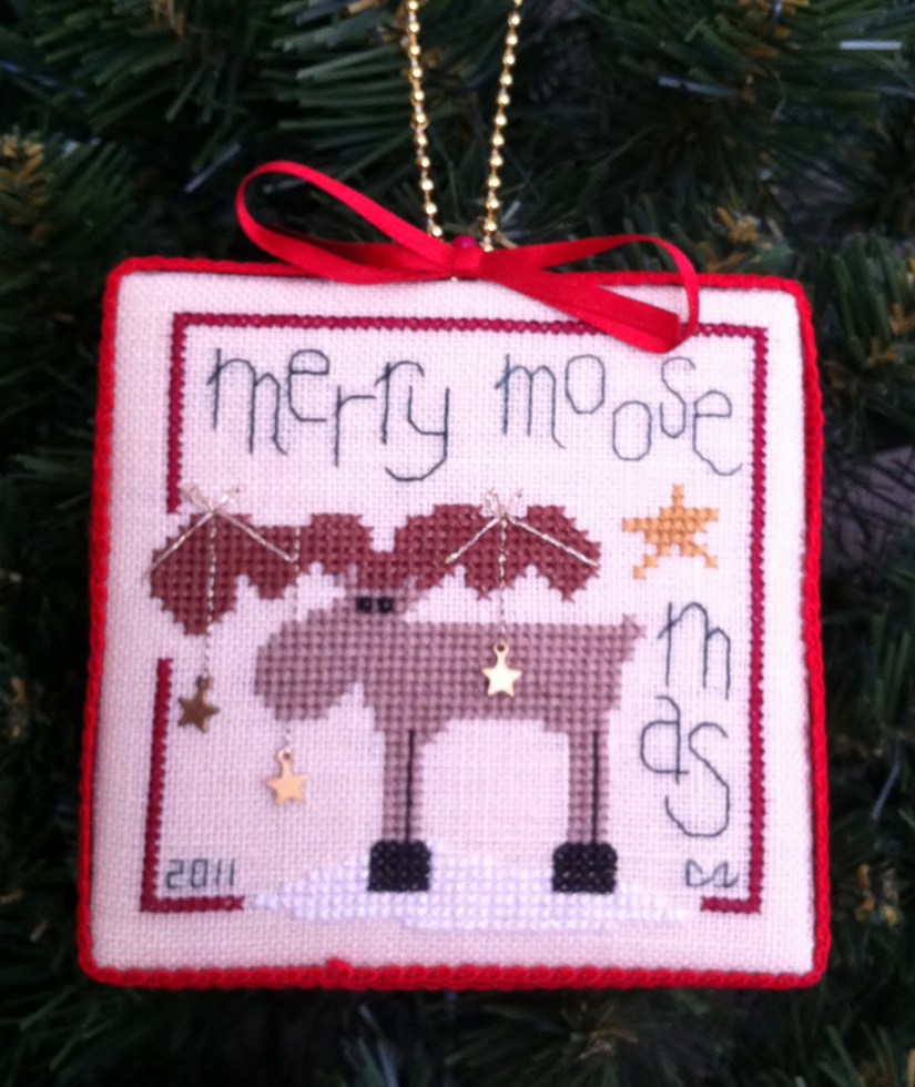 Last Monday I received an absolutely awesome ornie from my good friend Carol for our HoE Lizzie*Kate ornie exchange. I love the reason why Carol chose to stitch this one, as moose are indigenous in NH this is a wonderful personalised ornie with a taste of Carol’s home. I absolutely love it, and the stitching and finishing are as always perfect! Thank again Carol for another fantabulous exchange that I will treasure! 😀 I apologise in advance for the quality of all the photos today, as they had to be taken with my iPhone thanks to a flat camera battery that I just keep forgetting to charge up! Sadly moose ornie didn’t come up at all well on the iPhone 😦