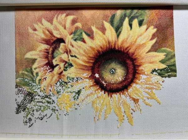 Mini Sunflowers” by Heaven and Earth Designs, before and after. Only about 3% left to go now, woohoo!