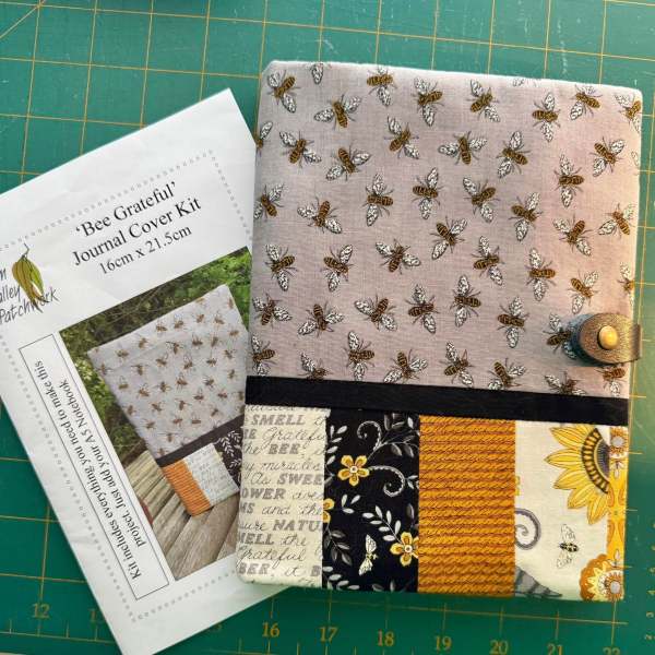 • Bee Grateful journal cover kit by Gum Valley Patchwork (started, and just needs the leather catch to be hand-sewn on before it can be fully finished)