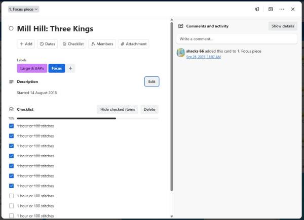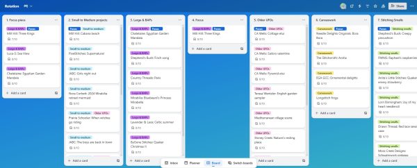This is how the Trello board rotation looks like, including 10 checkboxes where I can tick off every 1 hour or 1,000 stitches of stitching, depending on the project type. It means I don’t have to have a clipboard next to my stitching chair, and it’s on my phone all the time, plus I have the ability to drag columns around so the current rotation slot is always first on the screen. The app also syncs beautifully between the desktop version and my iPhone. Fingers crossed it works well – it seems to be going well so far 🙂 I’ve since added the project photos to every piece that I’m currently working on each column to make it easier visually to grab the next project in my rotation.