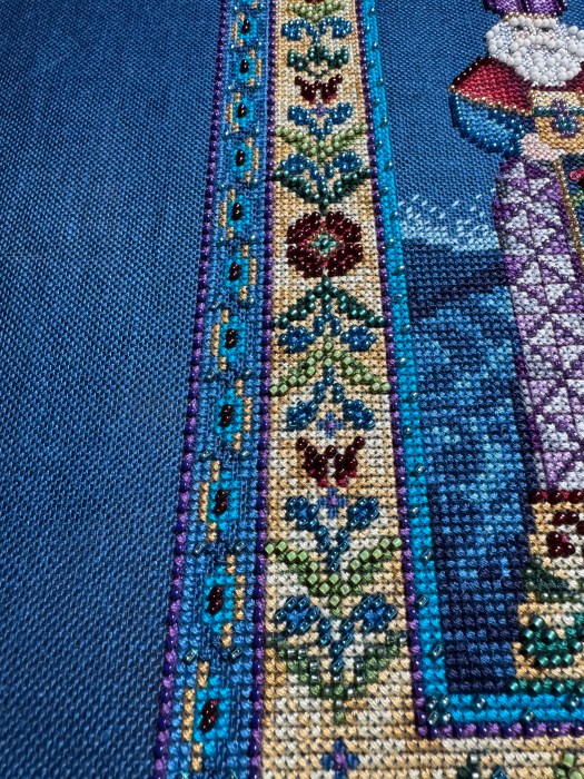 The beading of the borders has commenced, with two colours completed so far (purple petites and turquoise) – I’m halfway through completing the gold petites in the side borders. This is the most stunning project I’ve worked on in some time, it’s such a pleasure to look at, I’ll miss it when it’s finished.