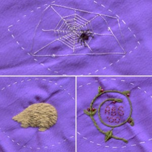 From Stumpwork Embroidery, Designs and Projects, by Jane Nicholas – Started April 2002. Class held at La Chatelaine, Mt Eden – tutor Elizabeth. Class taught the main elements of stumpwork stitching, but remainder of project to be completed at home.