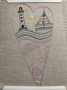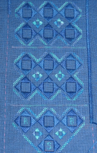 Class project from “Hoop is not a Four-Letter Word” – taught by Martha Schmidt, Heart of Cross Stitch Festival, Sacramento, CA, USA. The kit uses pink flosses and fabric lining, but I changed the colours to reflect my personal tastes more – and chose blues just for a change!